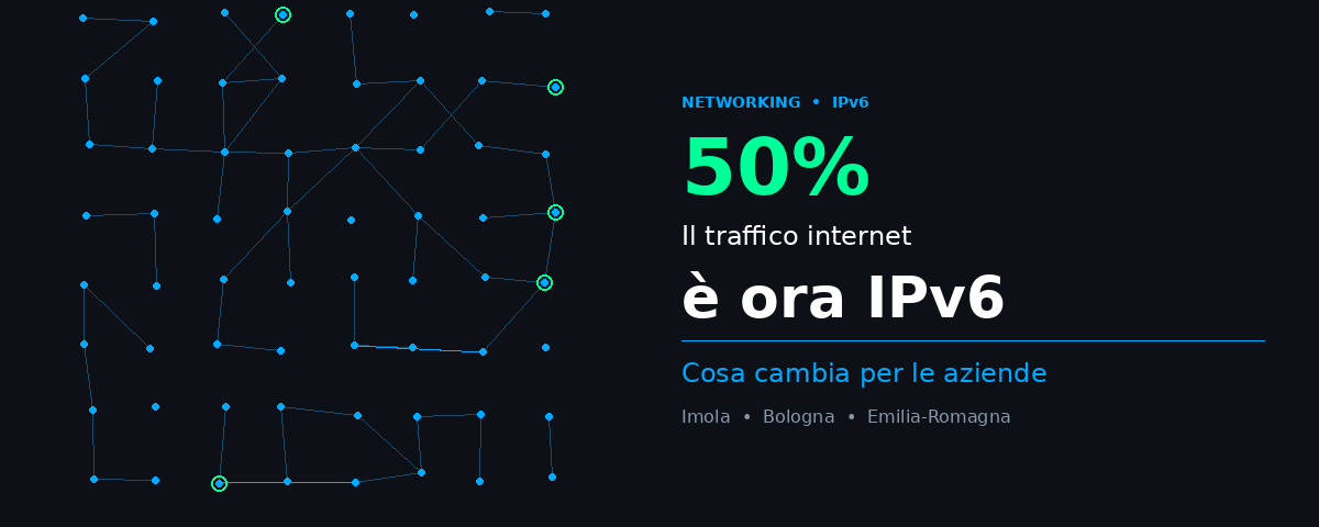 Per la prima volta nella storia, IPv6 ha superato la soglia simbolica del 50% del traffico internet globale: Google ha rilevato il 50,1% il 28 marzo 2026. Prima di entrare nei dettagli, chiariamo cos’è: IPv6 è la versione moderna del protocollo Internet che assegna un indirizzo univoco a ogni dispositivo connesso. Rispetto al predecessore IPv4, che offre circa 4,3 miliardi di indirizzi, IPv6 ne mette a disposizione praticamente infiniti (3,4 × 10³⁸), usa una notazione esadecimale (esempio: 2001:db8::1) e integra nativamente meccanismi di sicurezza (IPsec), routing più efficiente e autoconfigurazione degli host (SLAAC). Per le aziende di Imola, Bologna e di tutta l’Emilia-Romagna che gestiscono infrastrutture di rete, questo sorpasso non è più una curiosità tecnica: è un cambio di paradigma che richiede attenzione concreta.